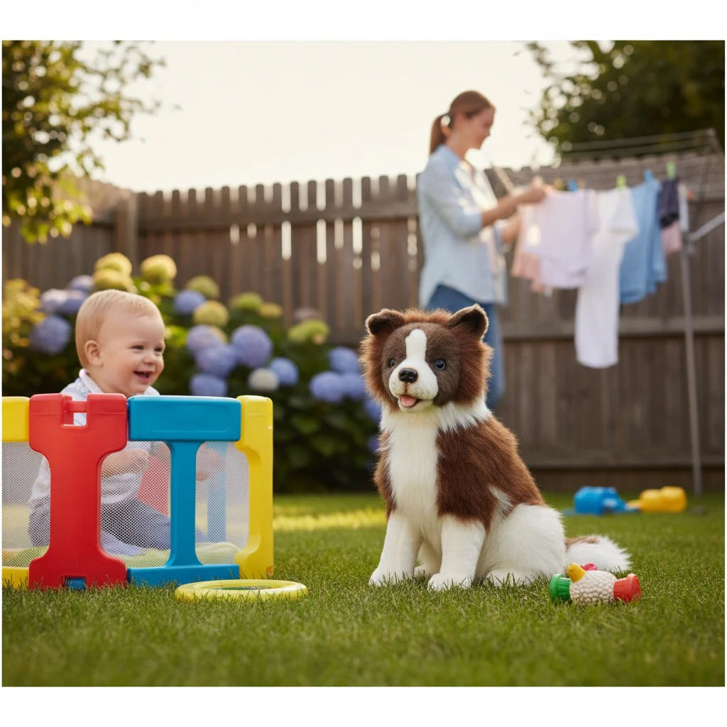 Brandy is a really cute realistic stuffed plush Border Collie dog in chaocolate and white colouring. She is a quality-made sitting Australian Sheepdog plushie.