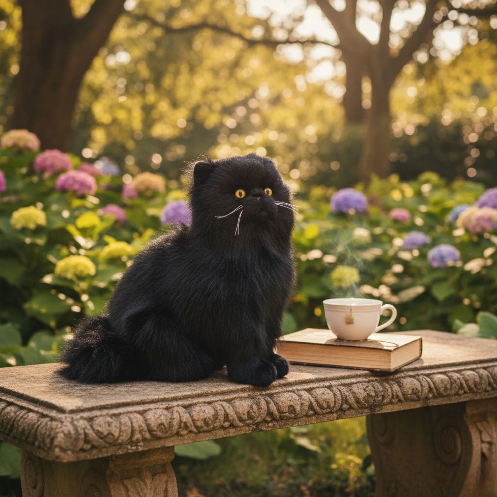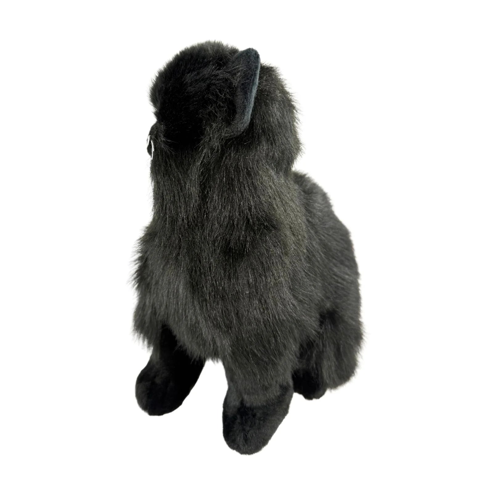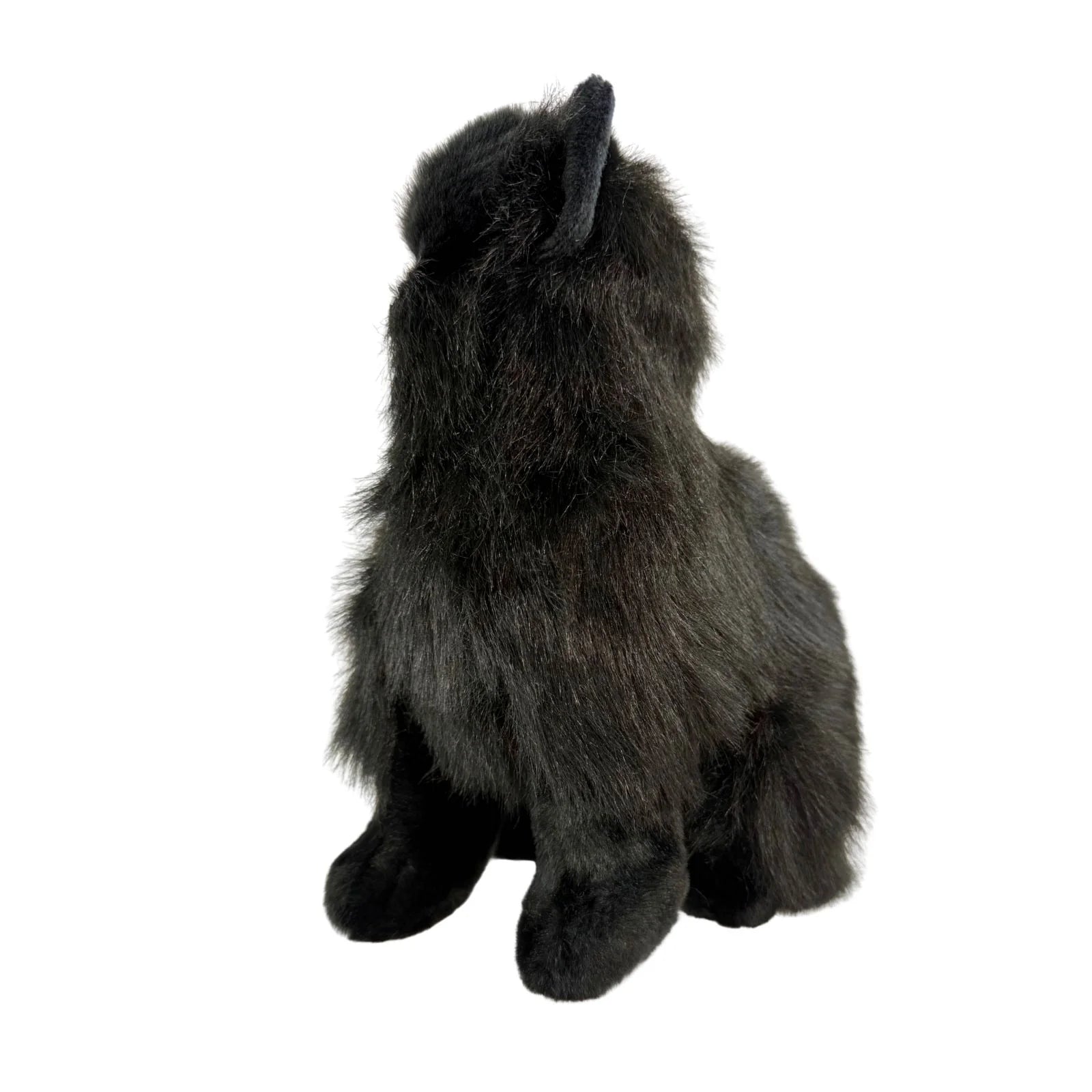 Crystal is a sitting Persian or Chantilly cat in a solid black colour and is a realistic soft plush toy and is a premium quality handmade soft long-haired yellow-eyed cat and is very cuddly.