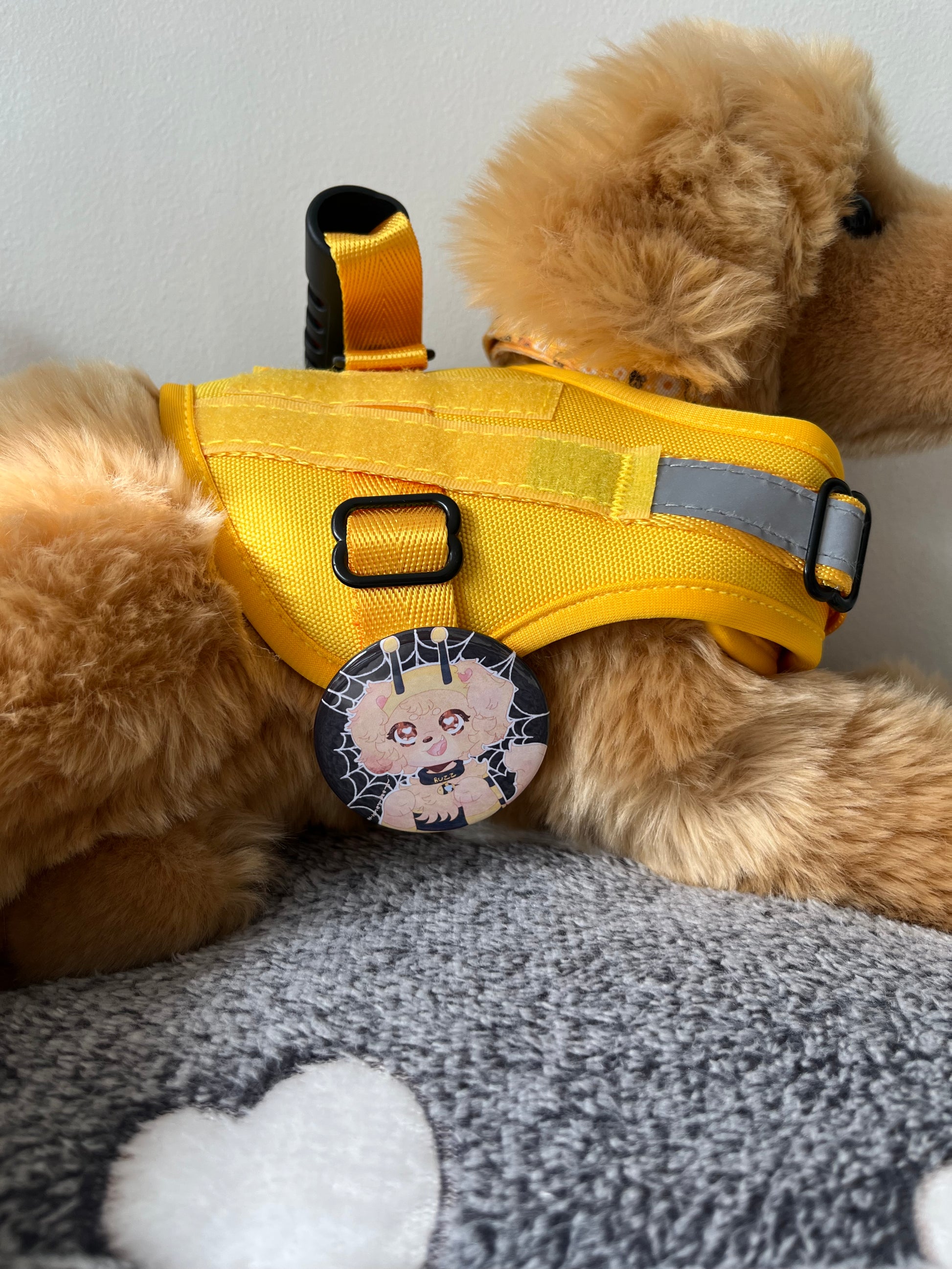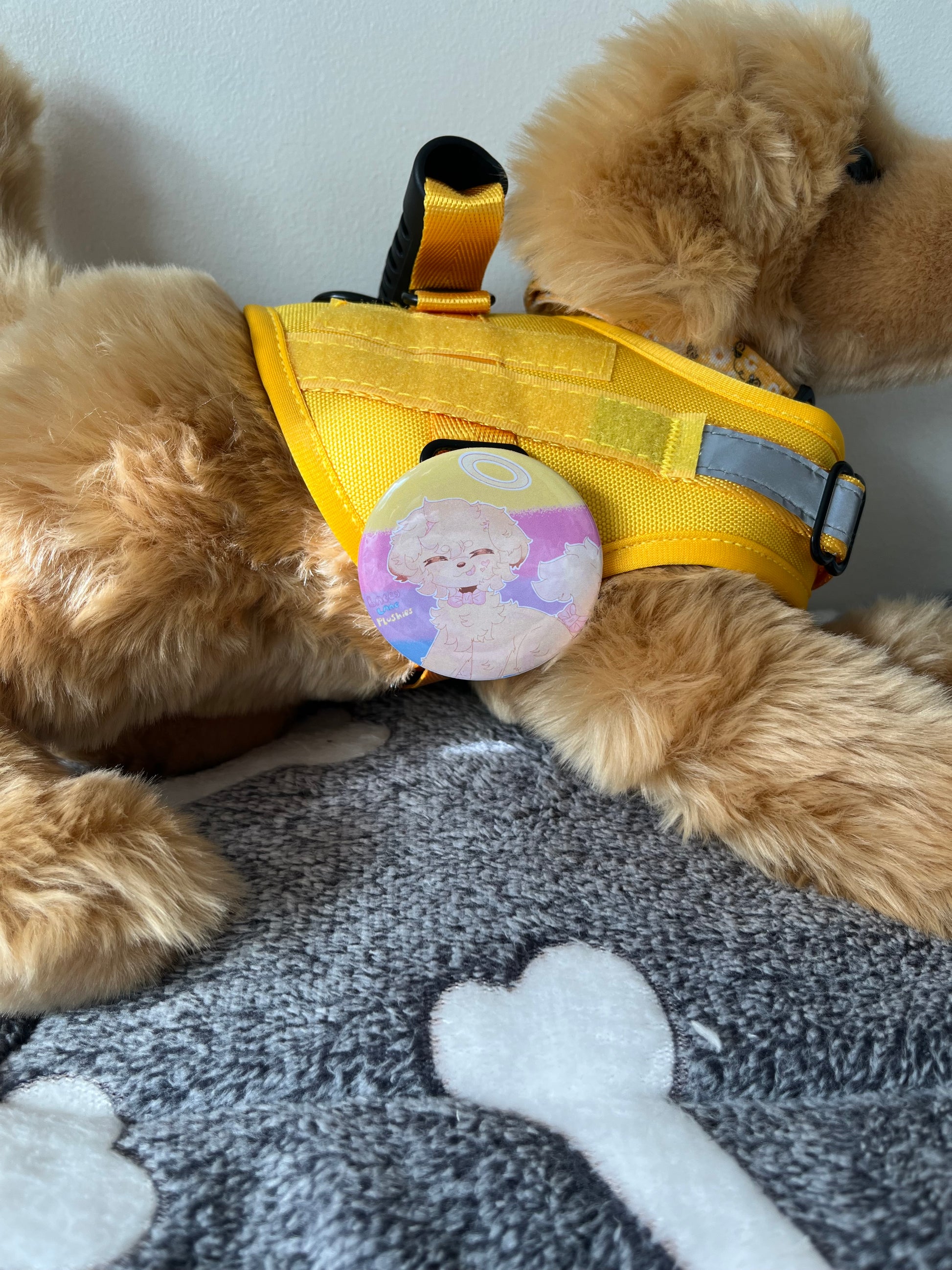 These cute badges can be pinned onto your dog’s vest, a bag or your clothing!