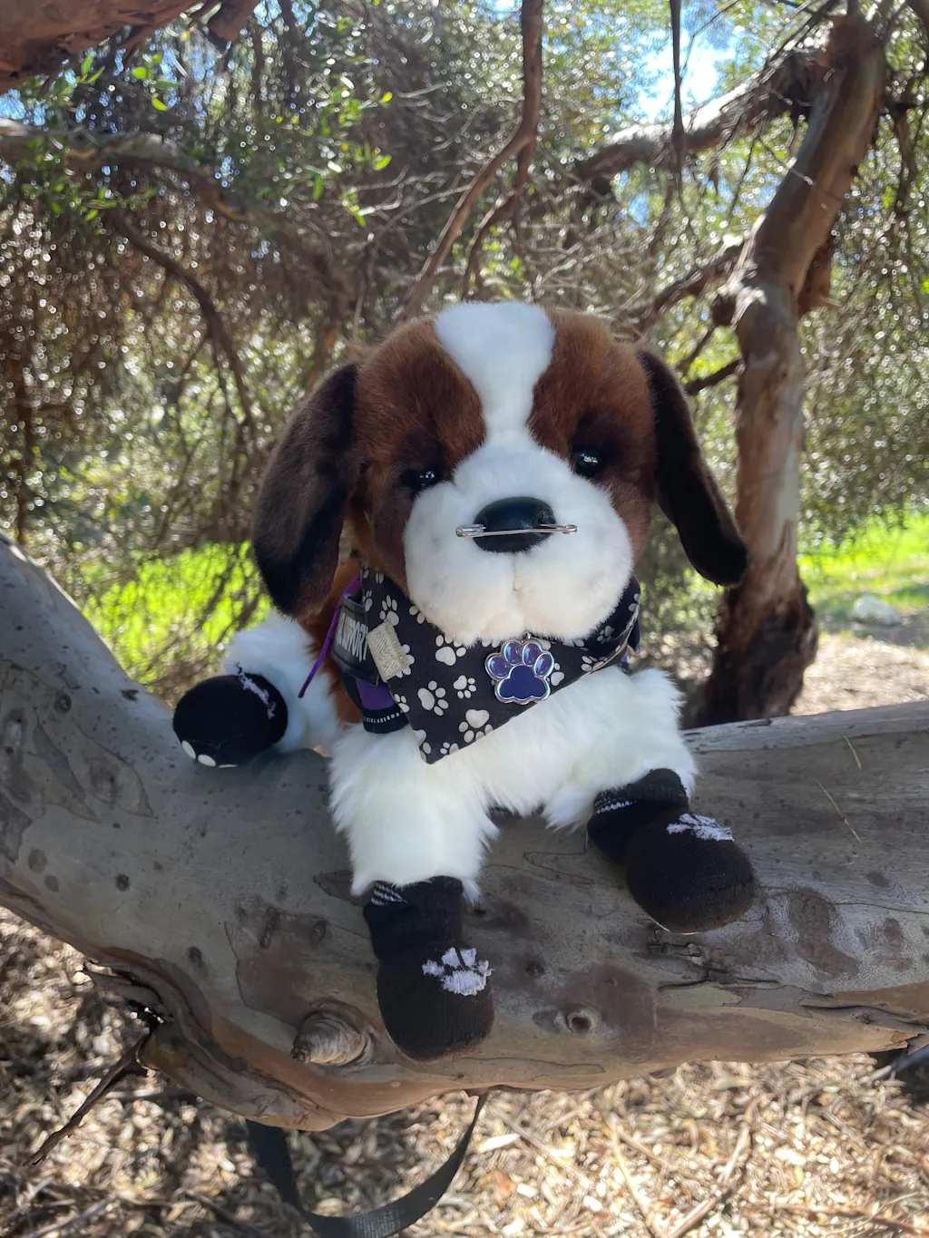 Like the Alpine rescue dogs this breed has come to be associated with, Oma the plush Saint Bernard will be quick to answer your call when you’re in need of a friend or want someone to snuggle! Her cuddly brown and white coat of faux fur is realistically patterned and ultra soft. Springy polyester fill and beans in her paws make Oma extra huggable and lifelike. To add to her realistic appearance, we’ve detailed Oma’s large floppy ears and face with rich, airbrushed accents. One look into this plush pup’s beautiful amber colored eyes and you’ll see her loving personality shining back at you. So when you’re in distress, just call for Oma and this sweet hearted St. Bernard stuffed animal will be by your side in a flash to see that you make it through!