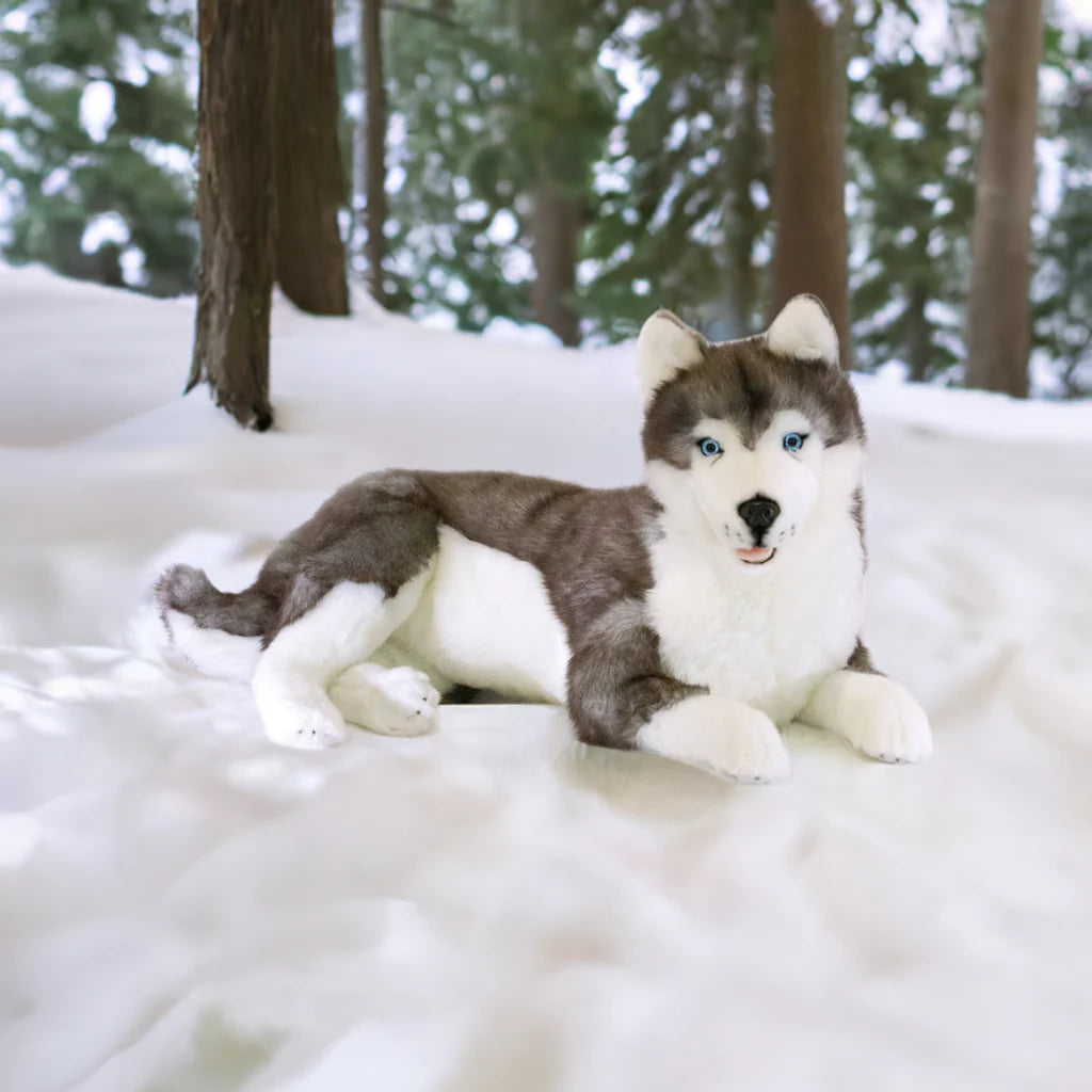 Rocco is a really cute extra large realistic almost lifesize stuffed plush Husky and is a quality handmade lying Siberian Husky plushie. He is one of our most popular 62cm dogs – particularly for retailers with elderly clients.