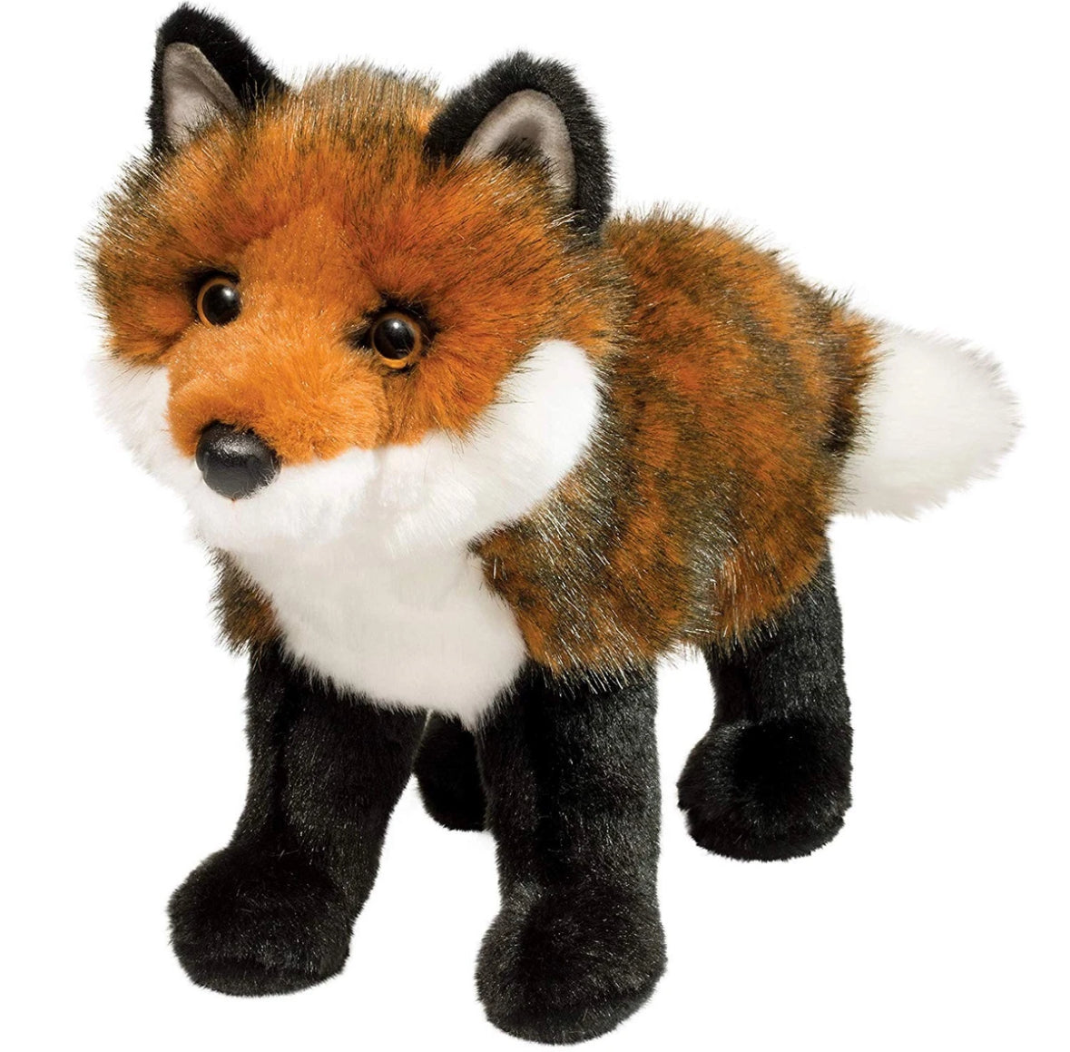 Featuring a soft russet coat of black tipped fur and loaded with realistic details, Scarlett is a Red Fox stuffed animal that is both lifelike and beautiful. High quality plush materials and soft polyester fill make her durable and cuddly. An engaging design gives our playful Fox kit a natural stand up body style. Bright amber colored eyes bring Scarlett to life while high black stockings and airbrushed details add to the lifelike appeal of this plush vixen. Designed in Keene, New Hampshire, U.S.A. by Douglas Cuddle Toys, makers of endearing plush toys for over 60 years. Measures 12" (30 cm) long, 5.5'' (14 cm) wide, and 9.5'' (24 cm) high. Safe for all ages over 24 months, surface washable.